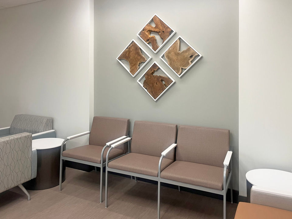 For this Sutter Roseville Urgent Care and Internal Medicine office, ACS curated a collection inspired by the nearby nature trails. With vibrant hues of natural greens and blues to give the space a lighter and brighter feeling and create a connection to the surrounding landscape of lush foliage and serene waters and offering comfort to those seeking care.